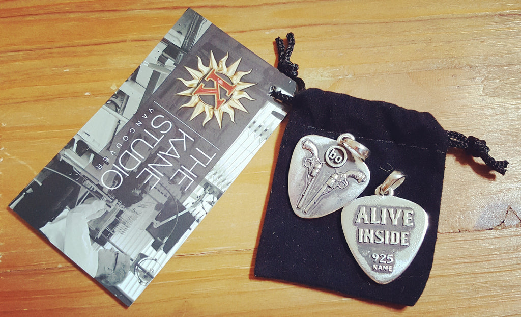 Their first project titled "ALIVE INSIDE" is a beautiful custom guitar pick pendant p featuring motifs on both sides; on one is Bo's trade mark with a pair of antique female dueling pistols in a high relief sculpt, on the reverse side "ALIVE INSIDE" is stated in a raised text sculpt.